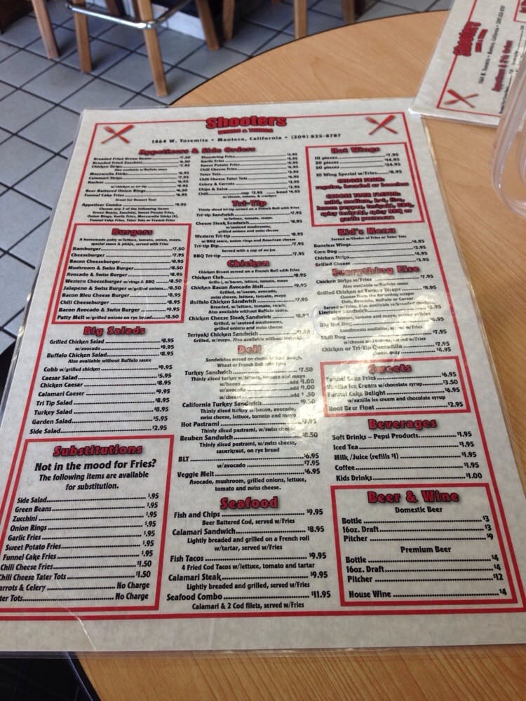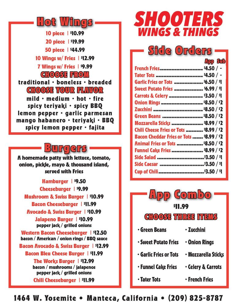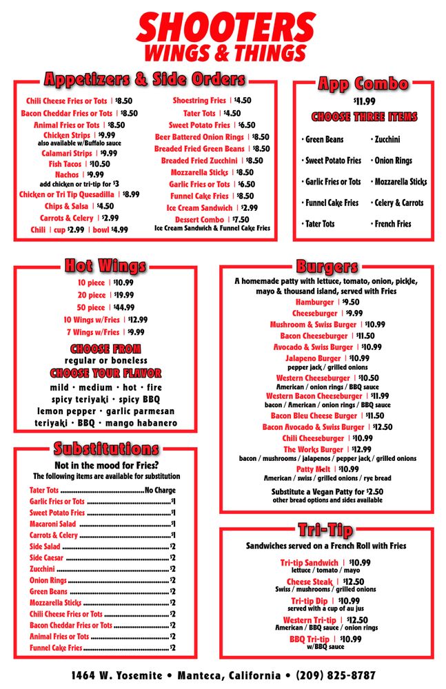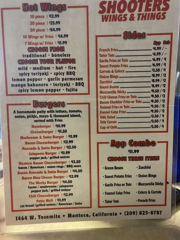 Introducing Shooters, a restaurant in Manteca, CA, specializing in burgers and chicken wings. They offer a variety of options for vegetarians and accept a range of payment methods, including Android and Apple Pay. The casual atmosphere is perfect for groups and families, with outdoor seating available. Customers rave about the friendly service and delicious food, like the BillsMafia-approved wings and the bacon blue burger. The menu also features items like big pretzels with nacho cheese, Western bacon cheeseburgers, and funnel cake fries for dessert. Overall, Shooters is a hidden gem with flavorful dishes and attentive staff, making it a must-visit spot for burger and wing enthusiasts in the area.